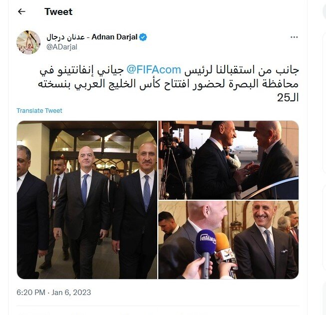 عدنان درجال، رئیس فدراسیون فوتبال عراق هم در توئیتر در یک پست که به خوش‌آمدگویی به رئیس فیفا برای حضور در افتتاحیه جام کشورهای عربی اختصاص دارد، از عبارت جعلی به نام جای نام خلیج فارس استفاده کرده است.